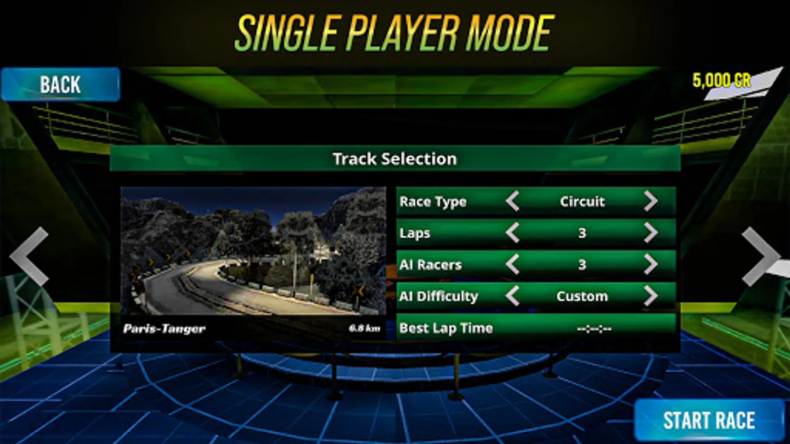 In a quick car race, select the track type, level of difficulty, and number of laps and opponent racers