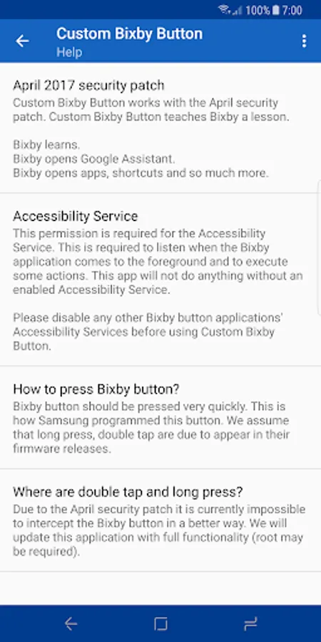 • Bind Accessibility Service: This permission is required for the Accessibility Service. This is required to listen when the Bixby application comes to the foreground and to execute some actions. This app will not do anything without an enabled Accessibility Service. Please disable any other Bixby button applications' Accessibility Services before using Custom Bixby Button.