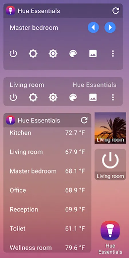 Create rooms and groups to organize your lights. You can even put a light in several groups. Place widgets for temperature sensors, easy control of lights, setting color and brightness without opening of the app.