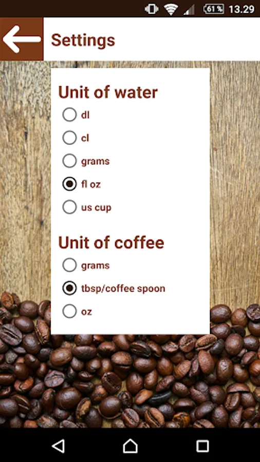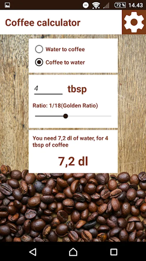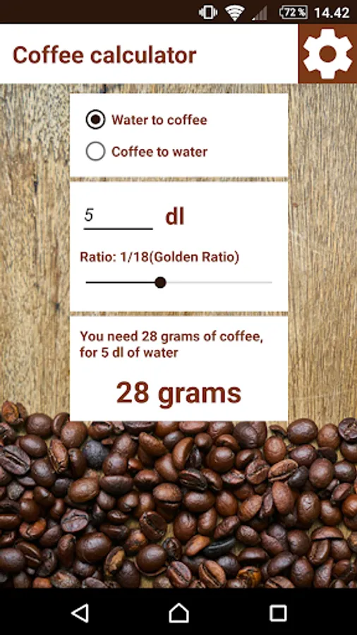 Use this coffee calculator to easily find out how much coffee beans you need for your cup of coffee, or to find out how much coffee you can make from the amount of coffee beans you have. The app have support for different ratios to best serve your taste.