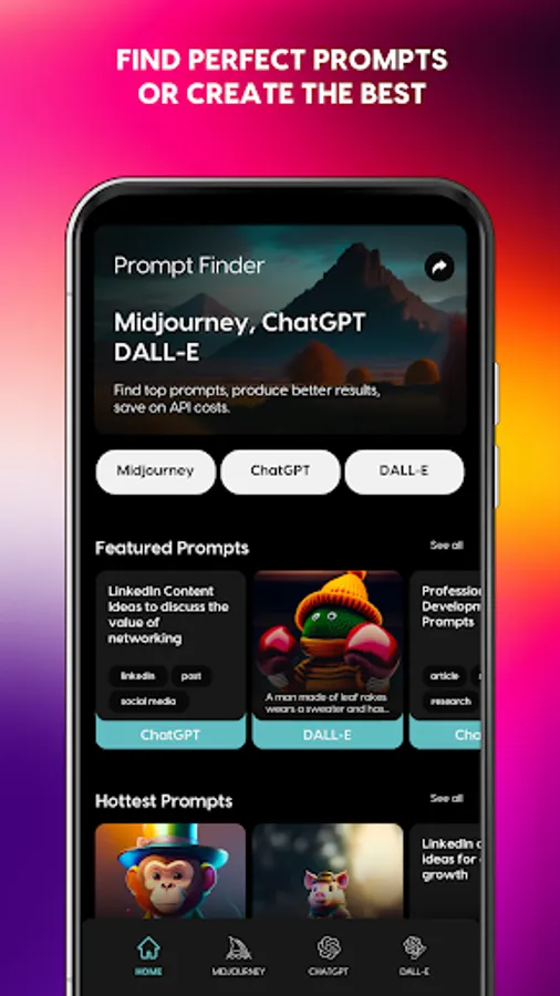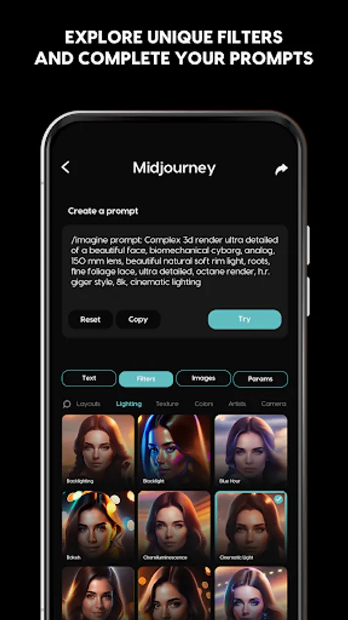This app is a Prompt Text Builder/Maker/Generator that harnesses the collective power of three advanced AI models: Midjourney, Dall-e and ChatGPT. Simply specify the genre, tone, or setting you desire, and the app will instantly provide you with the perfect prompt that aligns with your creative vision.