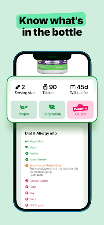 With SuppHero, you can easily discover if your supplements contain any of the commonly avoided ingredients such as GMO, Gluten, Soy, Dairy, or Lactose. Additionally, SuppHero also provides you with valuable information about whether your supplements are Vegan, Vegetarian, GMO-free, Gluten-free, Organic, Keto-friendly, Paleo-friendly, Halal, or Kosher.