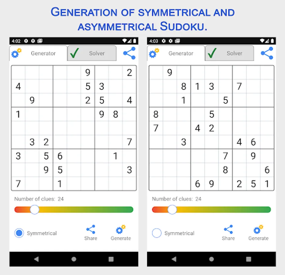 ✓ Generation of symmetrical and asymmetrical Sudoku.