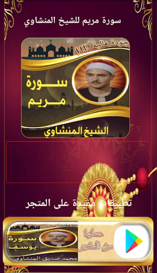An application that includes quality recitations of Surat Maryam by Sheikh Muhammad Siddiq Al-Minshawi without the net, with the most beautiful voice and the purest quality.