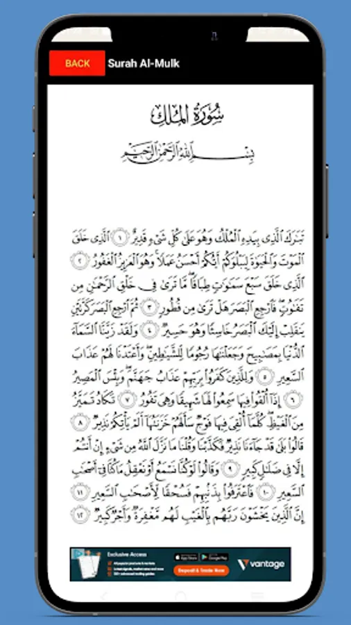 "Surah Mulk is a comprehensive application that provides users with easy access to the 67th surah of the Quran, also known as Surah al-Mulk. The application offers various features including audio readings by famous reciters, .In addition, the application includes tafsir ( explanation) surahs by renowned scholars to help users gain a deeper understanding of their meaning and relevance. The interface is user-friendly and easy to navigate, making it a great tool for daily reading and study. The app also includes a feature to listen to recitations in a loop and the audio speed can be adjust. Download Surah Mulk now to benefit from the spiritual wisdom of this powerful chapter."