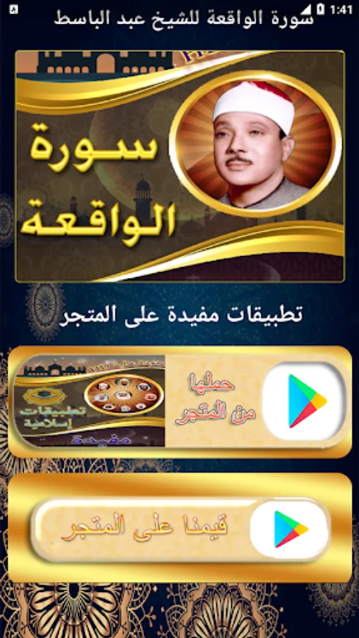 An application that includes the recitation of Surat Al-Waqi`ah by Sheikh Abdul Basit Abdul Samad without Net, with the most beautiful sound and purest quality.