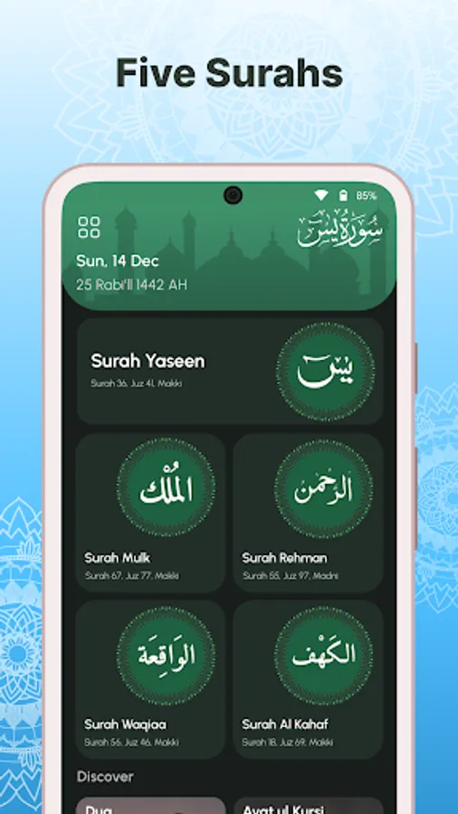 Surah e Yaseen (سورۃ یٰسین) is also known as the "Heart of Quran" and has divine virtues. Panj Surah & Surah Yasin app is a must-have for those seeking to conveniently access essential Surahs from the Al Quran. With Surah Yaseen & Panj Surah application, users can easily access all the crucial القرآن الكريم Surahs in one place. Five Surah or Surah Yaseen app offers an audio recitation of each Surah, enhancing the user experience.