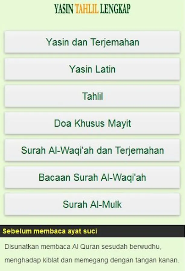 Aplikasi Surah Yasin ini simple dan ringan. Didalamnya mengandung terjemahan Bahasa Melayu / Malaysia / Bahasa Indonesia.
