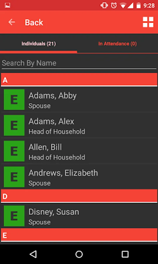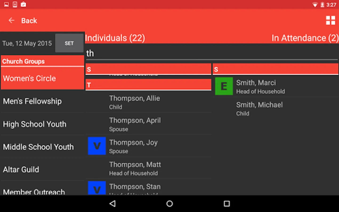 Attendance lets you take attendance for classes, groups and events for any date. Tap an individual to mark or un-mark their attendance, and your change is filed instantly in your database and will appear in standard CDM+ windows and reports.