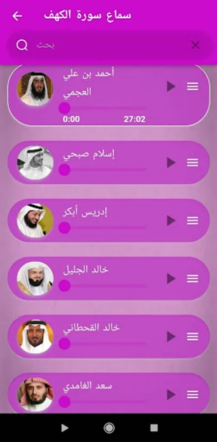 • Hearing Surat Al-Kahf on Friday: The application contains a number of reciters’ voices, including (Ahad Al-Ajami, Islam Sobhi, Idris Abkar, Khaled Al-Jalil, Khaled Al-Qahtani, Saad Al-Ghamdi, Saud Al-Shuraim, Abu Bakr Al-Shatry, Abdul-Basit Abdul-Samad, Abdul Rahman Al-Sudais, Ali Al-Hudhaifi, Ali Jaber, Maher Al-Mailqi, Muhammad Jibril, Muhammad Siddiq Al-Minshawi, Mahmoud Khalil Al-Hosari, Mashari Al-Afasy, Nasser Al-Qatami, Hazza Al-Balushi, Wadih Al-Yamani, Yasser Al-Dosari).