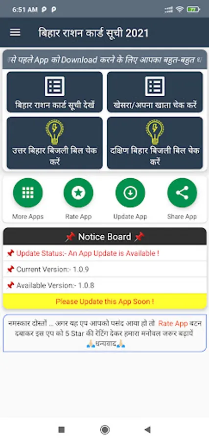 This (बिहार राशन कार्ड सूची 2023) app is not an official app of Bihar Govt. This App provides you direct links of खाद्य एंव रषद विभाग बिहार official websites where you can check your name in ration card list 2022 online in your mobile. All the web links available in this app are belongs to their respective owners only. It is hereby strongly disclaimed that we shall under no circumstance be liable for any failure to check or view your name in ration card list through this app because this is not an official app.