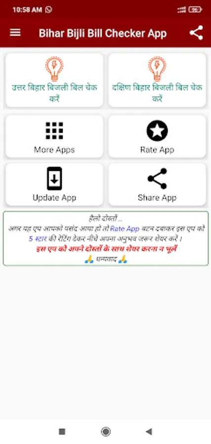 Bihar Bijli Bill Pay- Bihar Bijli Bill Check App (NBPDCL & SBPDCL) is a very useful for Bihar Electricity users to check their home or office light bill without going to any office. We do not collect any kind of data related your light bill . So please don't share your personal information to any one in any way.