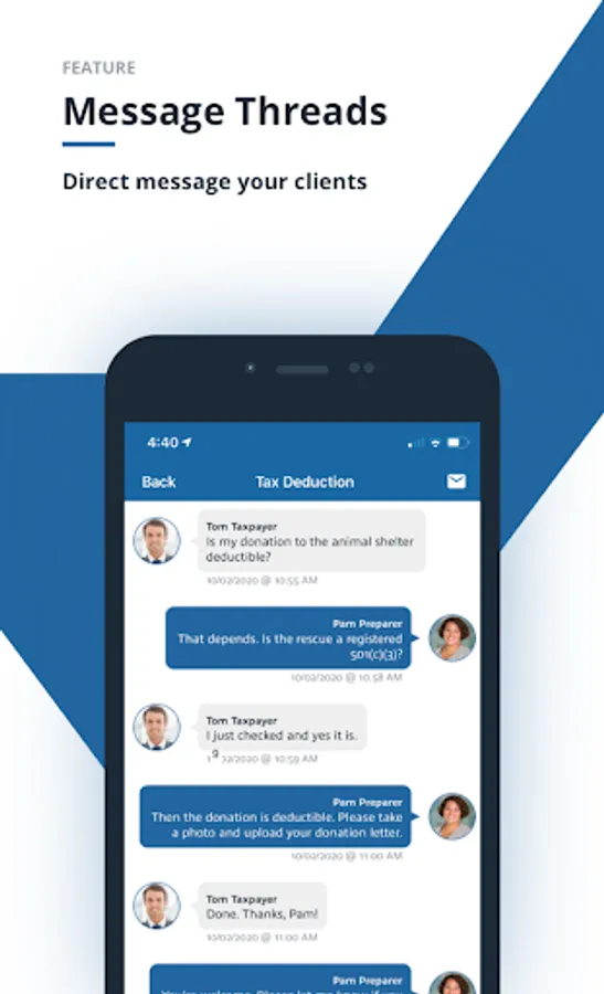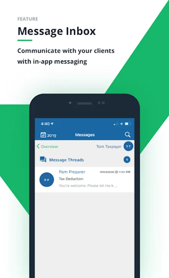 The SurePrep Mobile App makes communicating with your TaxCaddy clients a breeze by allowing you to send and reply to messages from your mobile device without requiring you to log into SurePrep FileRoom. When clients send you messages you can view them and respond in seconds. Waiting on a document from a client? Simply send them a reminder from your phone!