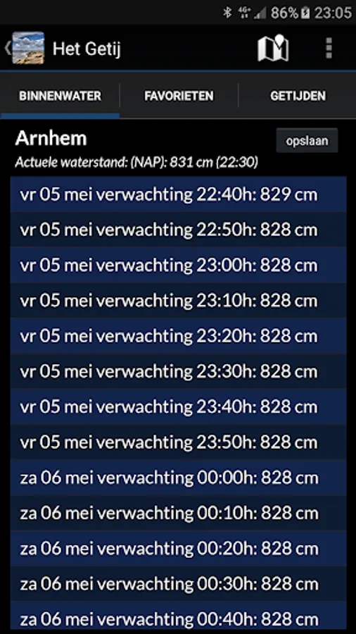 The Getij shows the water levels at tidal locations as well as live water levels and water level expectations in the major rivers, IJsselmeer and Scheldt, up to Antwerp.