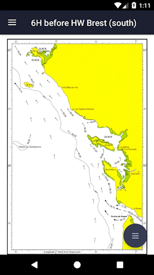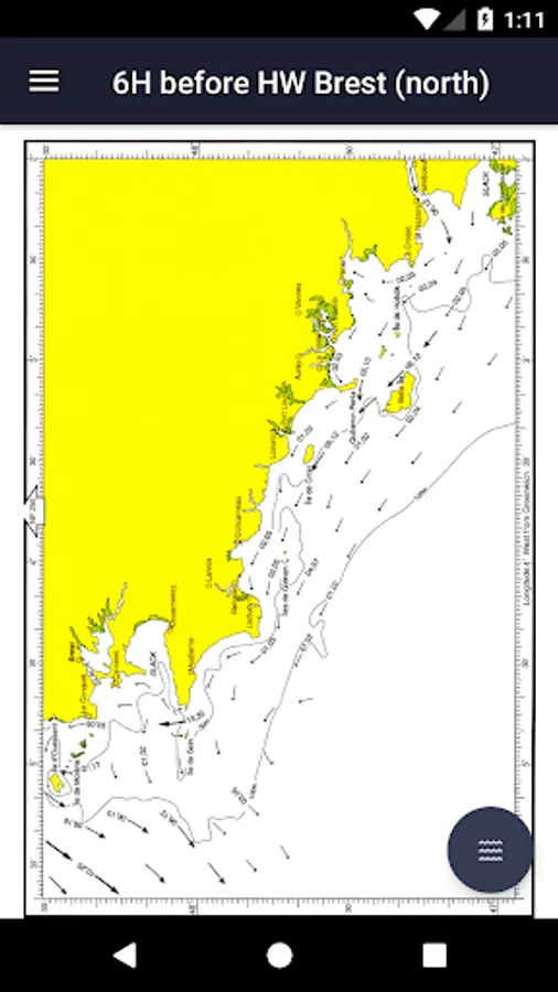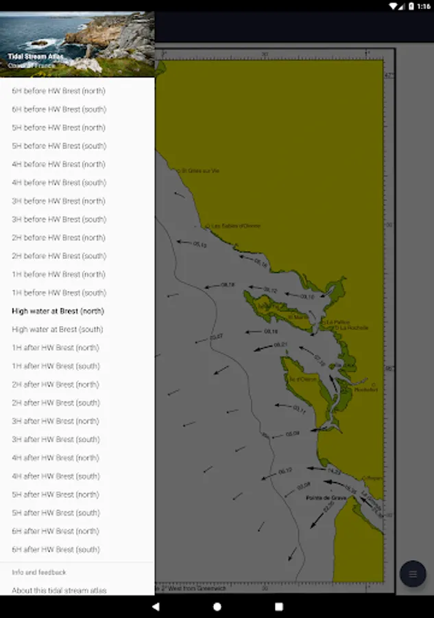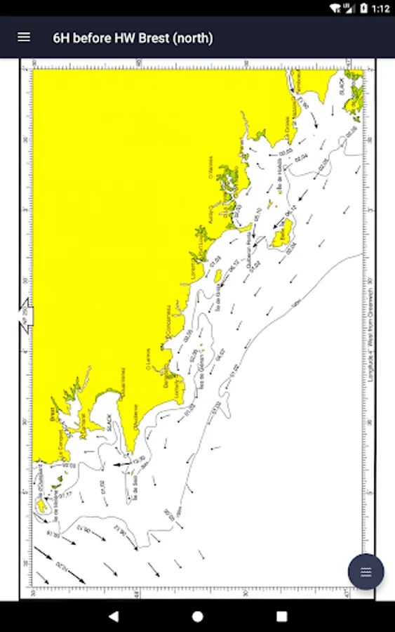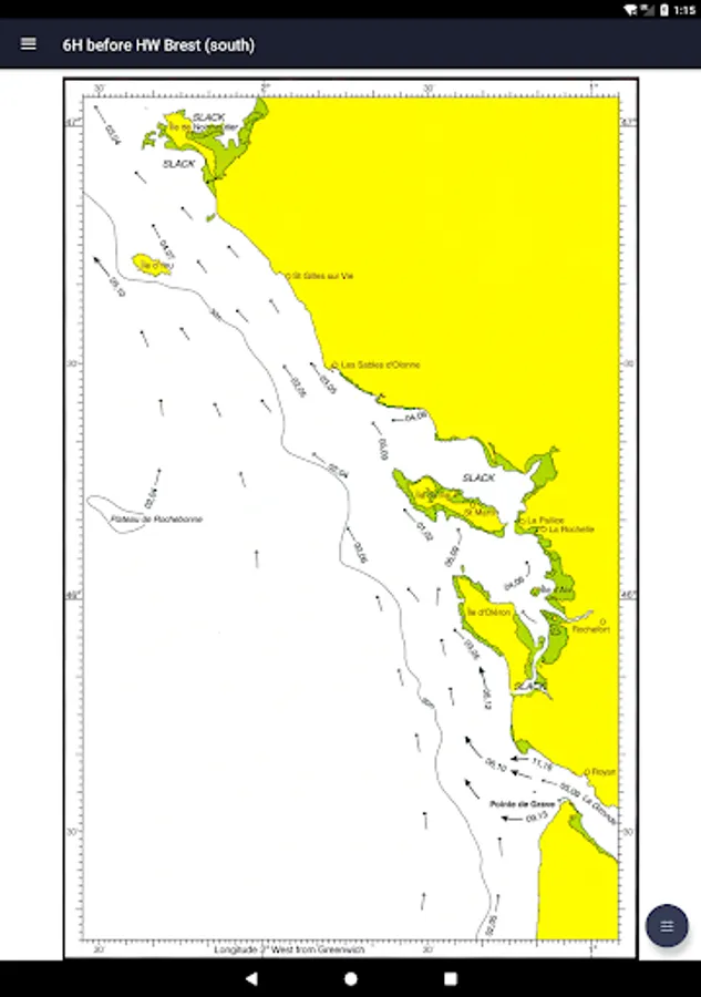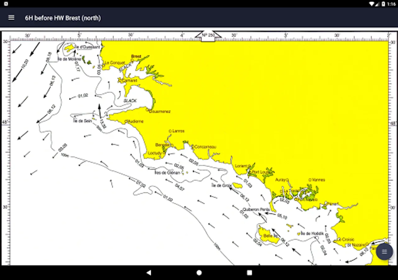All 26 charts are available offline. The charts show both direction and rate of tidal streams at hourly intervals by careful and accurate use of graded arrows and display mean neap and spring tidal rates in tenths of a knot. The app also shows you today's tides at Brest, for which an internet connection is required.