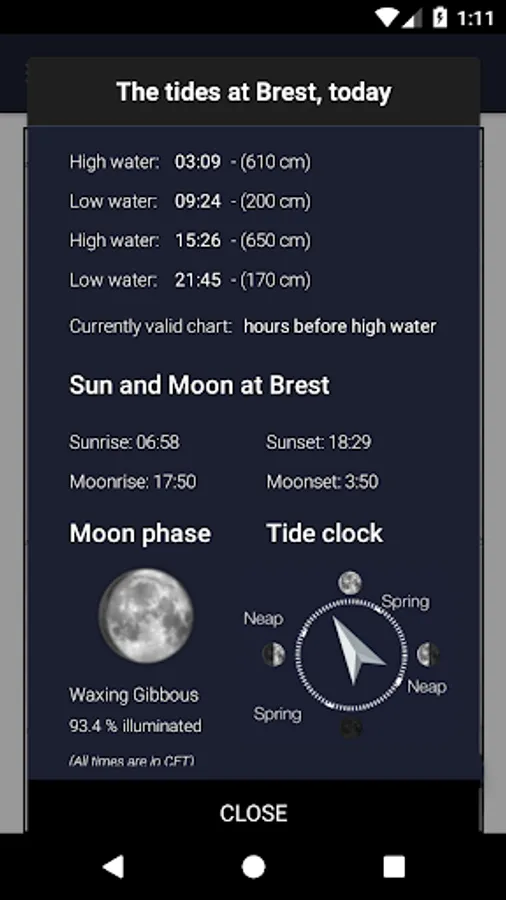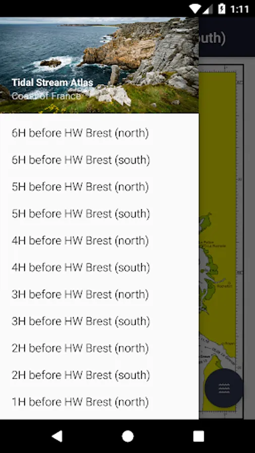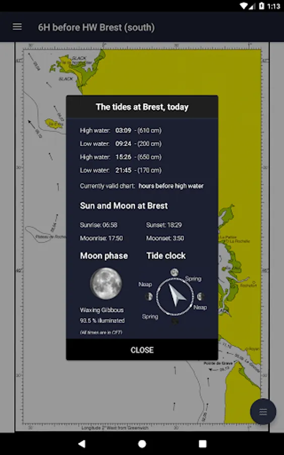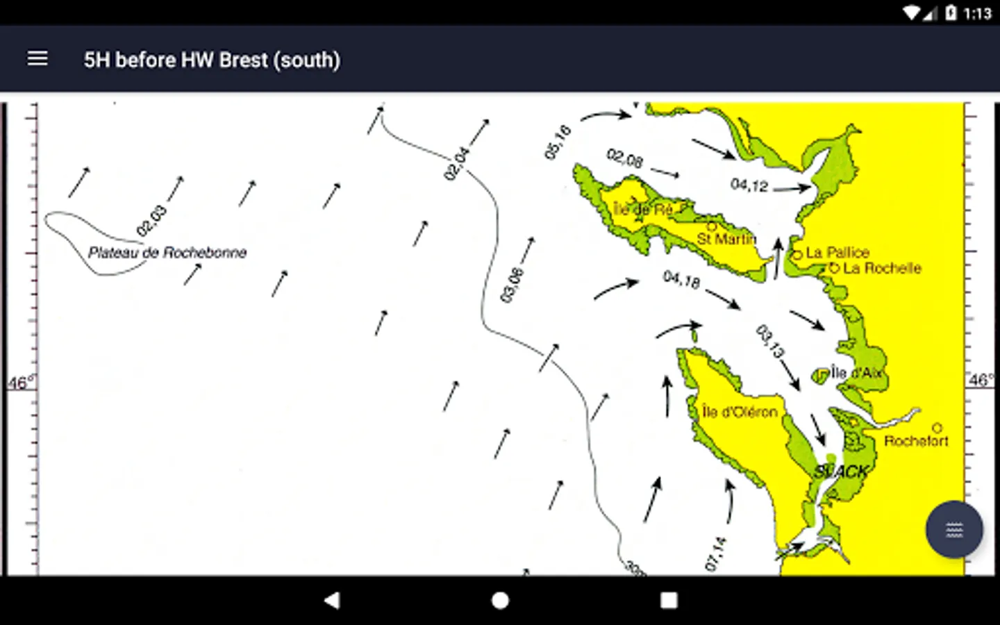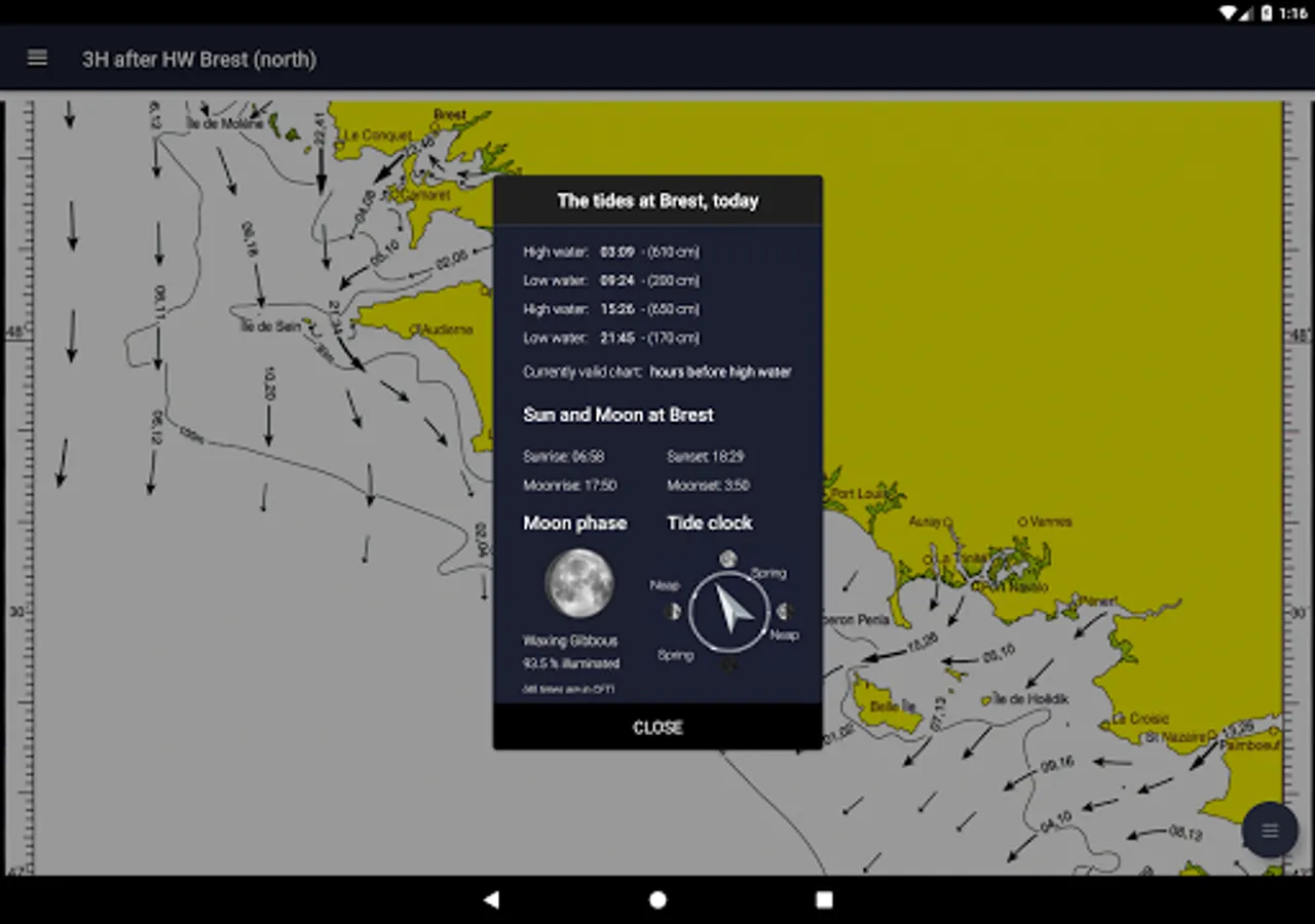 All 26 charts are available offline. The charts show both direction and rate of tidal streams at hourly intervals by careful and accurate use of graded arrows and display mean neap and spring tidal rates in tenths of a knot. The app also shows you today's tides at Brest, for which an internet connection is required.