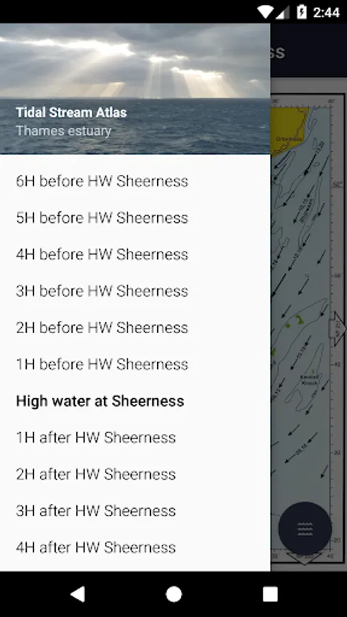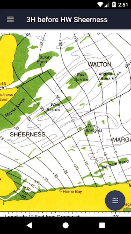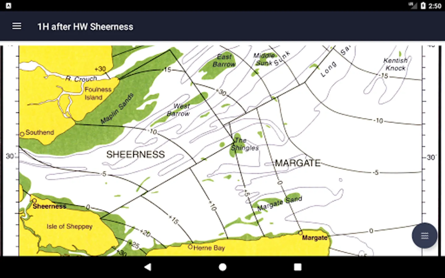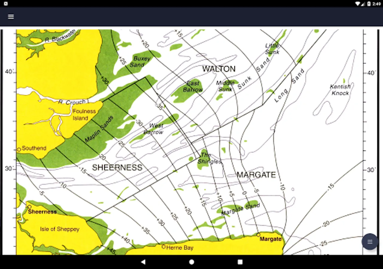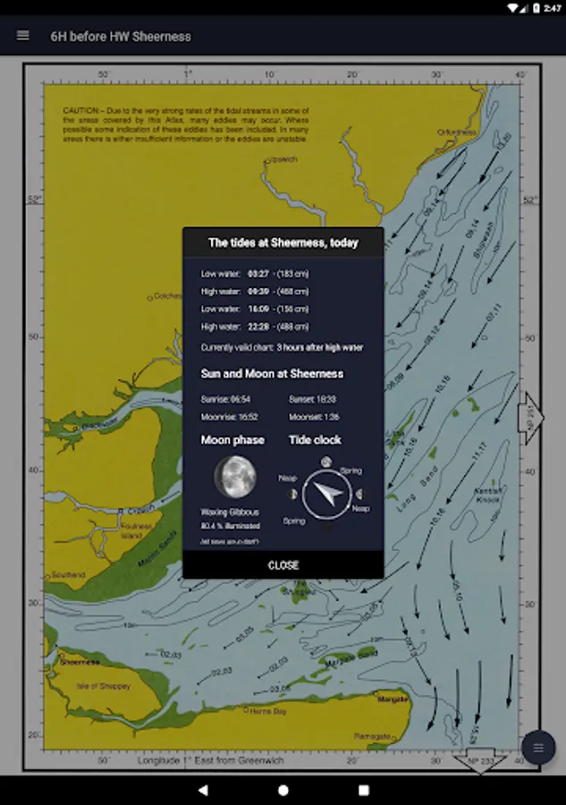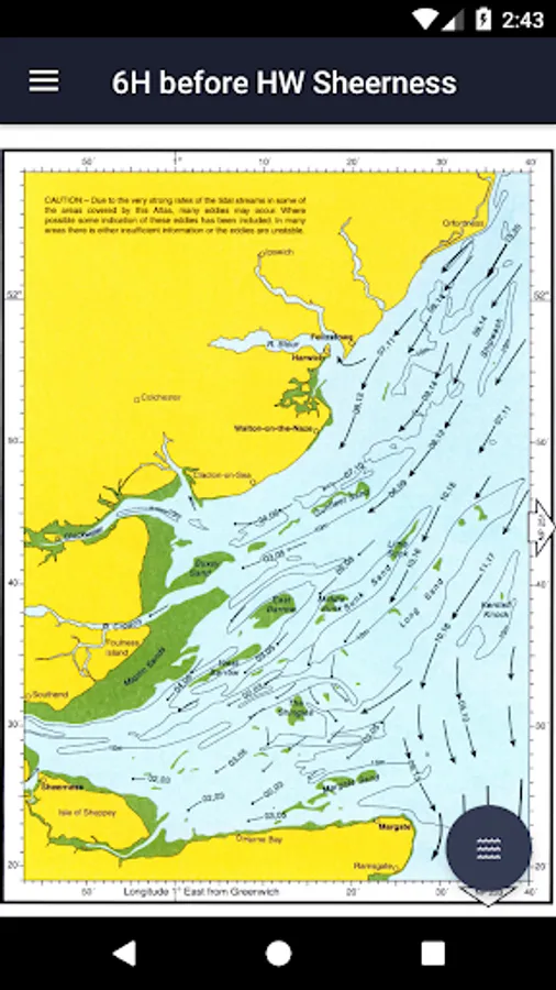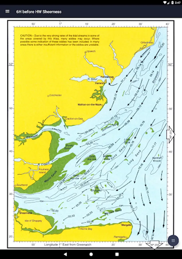 All 19 charts are available offline. The Tidal Atlas charts show both direction and rate of tidal streams at hourly intervals by careful and accurate use of graded arrows and display mean neap and spring tidal rates in tenths of a knot. The app also shows you today's tides at Sheerness, for which an internet connection is required.