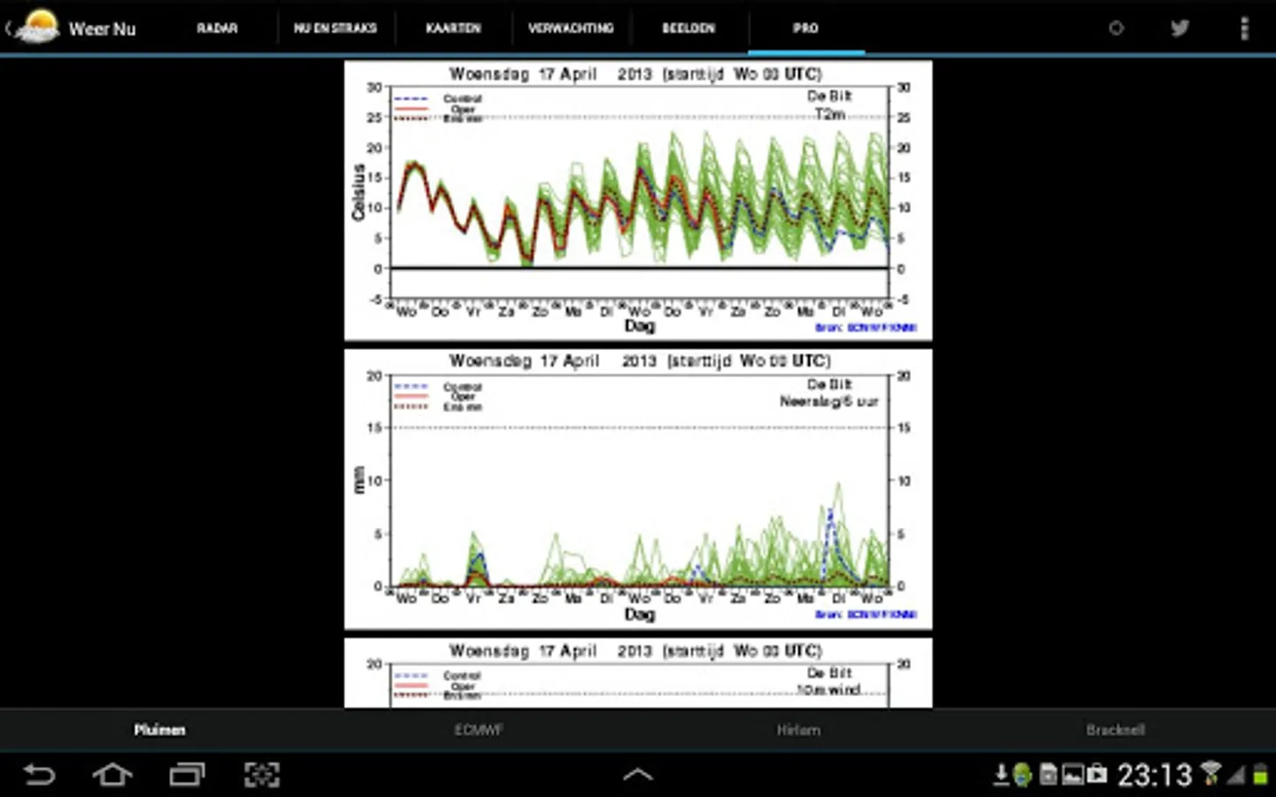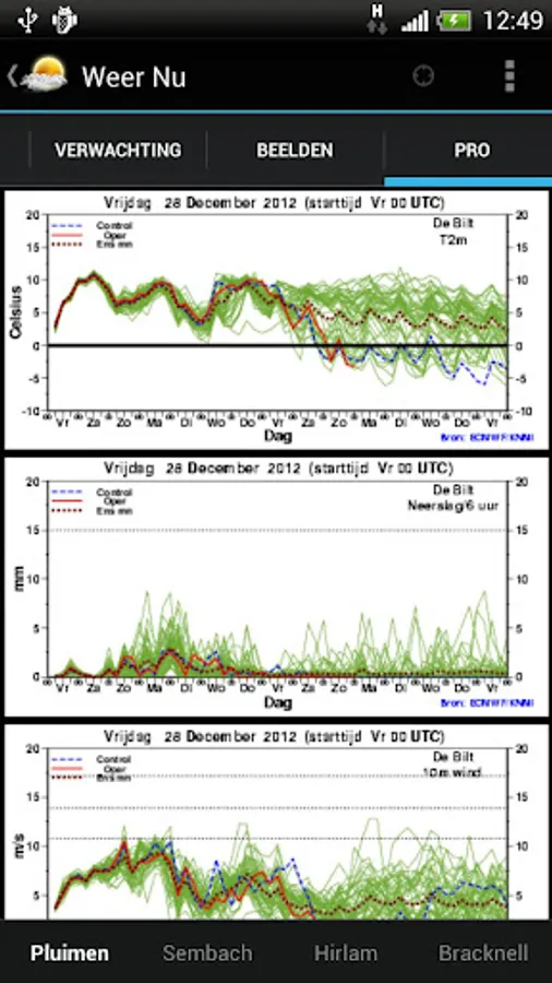 √ Plume Graphs with the five-day temperature, wind and precipitation expectation + snow index and ijspluim (expected ice growth).