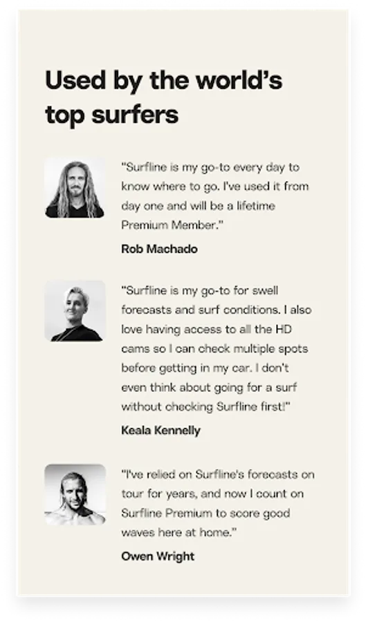 “Surfline is my go-to every day to know where to go. I’ve used it from day one and will be a lifetime Premium Member.” – Rob Machado