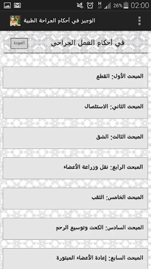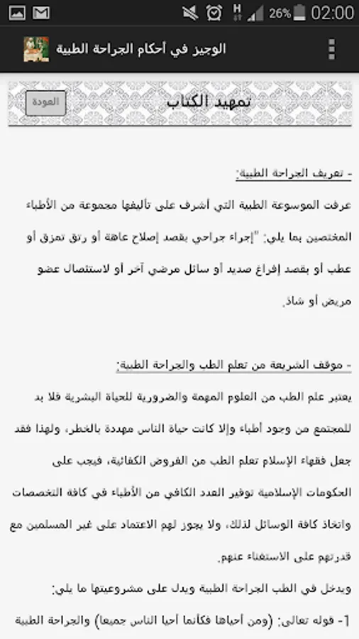 This application is a summary of laws and regulations governing the technical and ethical ascpects of the surgical practice from an islamic point of view. It is aimed at surgeons, physicians, and other healthcare providers willing to know more about islamic ethics and regulations in healthcare and medical practice.