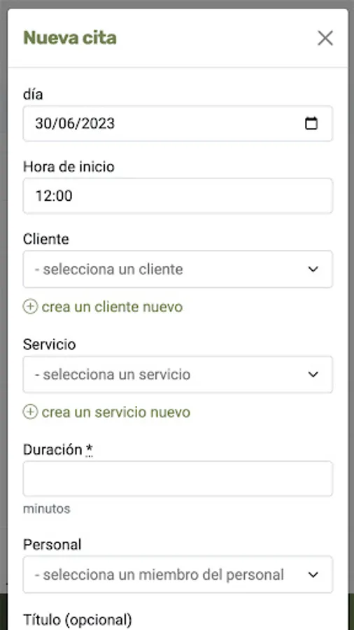 Through our intuitive calendar, with just a couple of clicks you can create an appointment and enter your client's data, the service provided and even assign the appointment to one of your employees (we also offer personnel management).