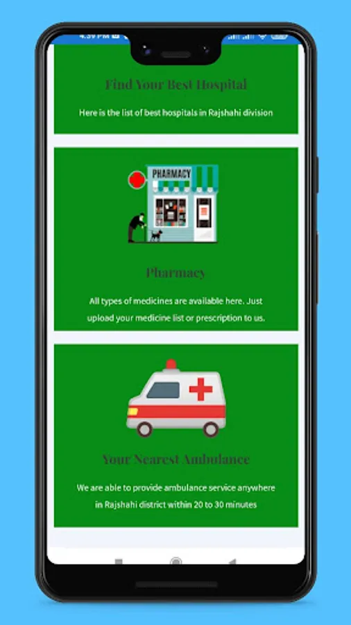 Our aim is to provide a quality treatment at low cost to the common man. One of our objectives is to reduce the suffering of the common people by providing ambulances in a quick and short time. Our mission is to deliver hassle-free pharmacy services from village to village. Our service is a humanitarian service. We want to provide our services to common people. We are responsible for the privacy of each of our users. By using our service you can access medical services, ambulance services, pharmacy services and health services.