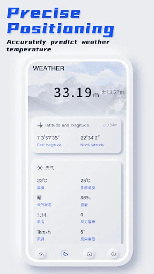 The Altimeter tool - altitude app is a smart tool that can display the current position, altitude and orientation in real time. Hiking or hiking at high altitude can view the current longitude and latitude position, coordinates, current real-time orientation, weather and temperature in real time. It is an indispensable tool for outdoor activities.