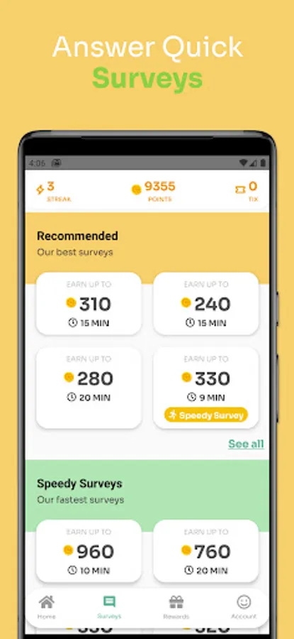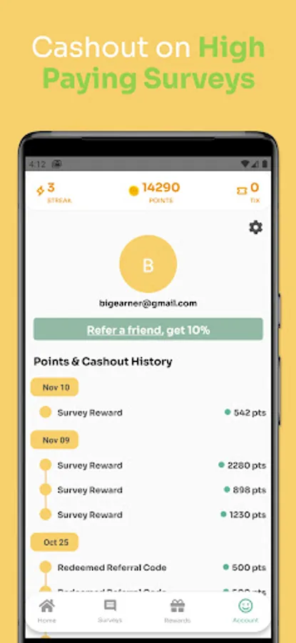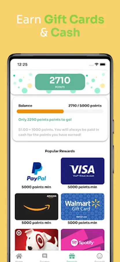 Make money & easily cash out with surveys for cash. We pay up to twice as much as other survey apps, because you deserve to earn the money you make. Low minimum cashouts and exciting opptunities mean you'll get paid for surveys quickly. With each cash survey, you can redeem your points for giftcards, Paypal money or even exclusive discounts.