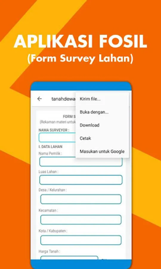 Fossil stands for Land Survey Form. PT. DewaLapak Migunani Jagat produces FOSSIL applications with the aim of making it easier for you especially in the property sector, which is the data from land / property survey results when you offer / submit to investors (Buyers).