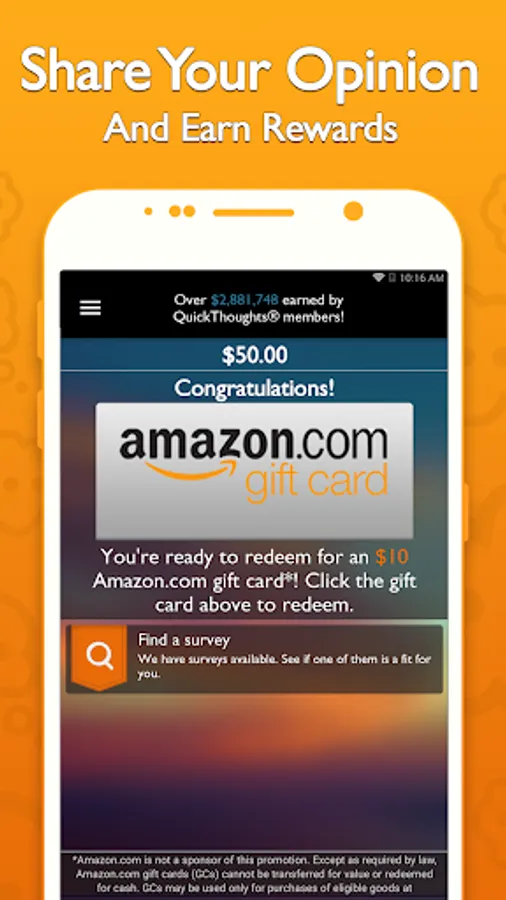 QuickThoughts rewards you with FREE iTunes Gift Cards for sharing your thoughts via quick surveys and local survey events! Earn rewards on the go and redeem them for free $10 gift cards!