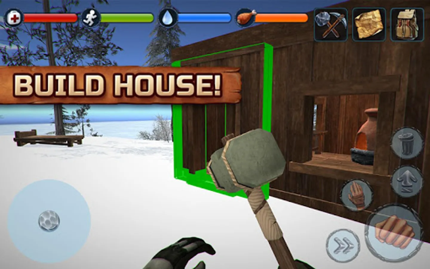 - Using resources you can craft weapons for hunting animals, a torch and a fire for light at nights, as well as materials for building a house