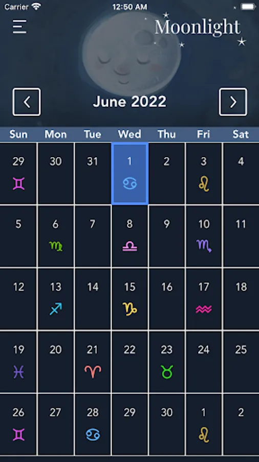 • It takes the moon 2.5 days to travel through one sign, so the app’s simple calendar reveals which zodiac sign the moon is traveling in for each day and the exact time it changes signs. Some signs that the moon travels through are especially favorable for certain actions—find out the details.