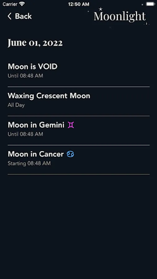 Some days the moon never goes void, other days the moon will go void for a few minutes, and still other days the moon will be void for several hours—possibly for the entire day or, in rare cases, for several days. Every day is unique, so the void is never repeated in the same way, the reason you need Susan’s Moonlight app.