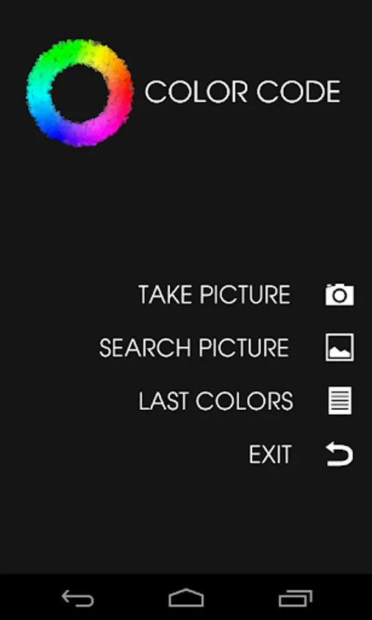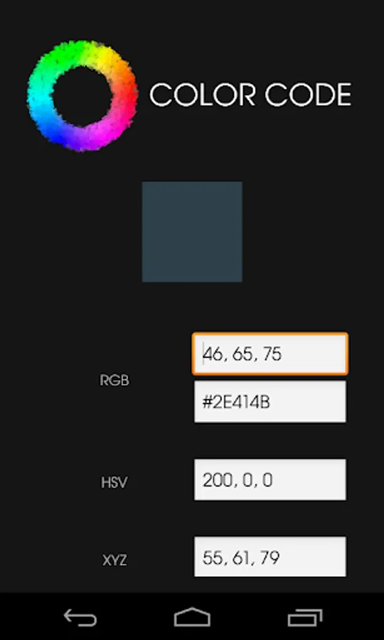 Color Code lets you know the RGB, HSV and XYZ code of a picture's average color. This app lets you choose the picture from the gallery or take it with your phone's camera. This app also lets you browse the last ten colors you examined.