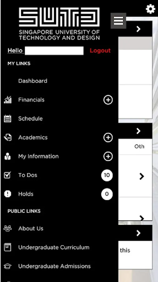 As our guest, you can access about SUTD such as News, Admissions, Events, FnB/Retail, Campus Map, Social Media.
