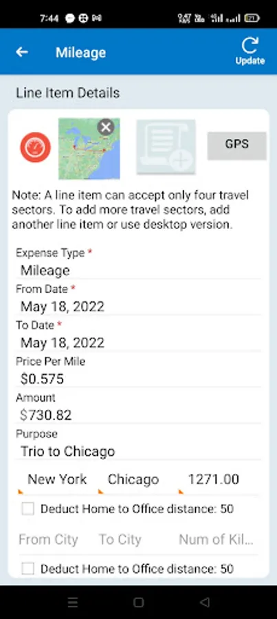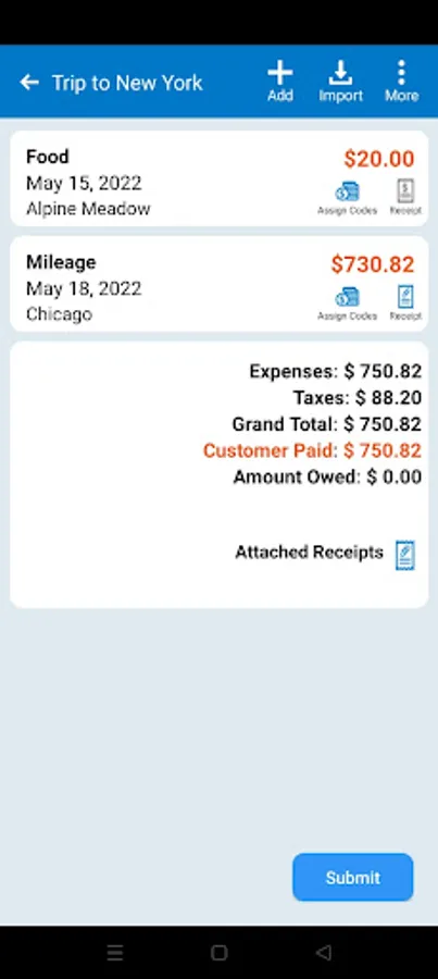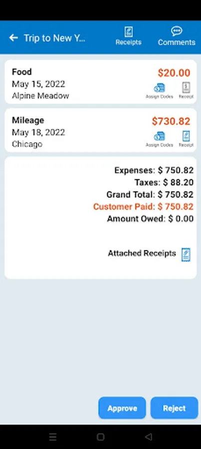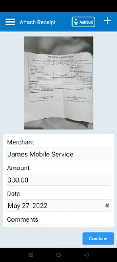 Capture receipts using your phone camera, upload and attach them to a line item on the expense report.