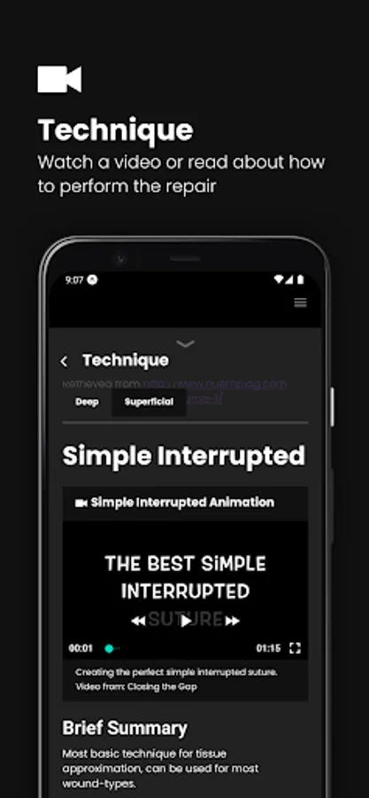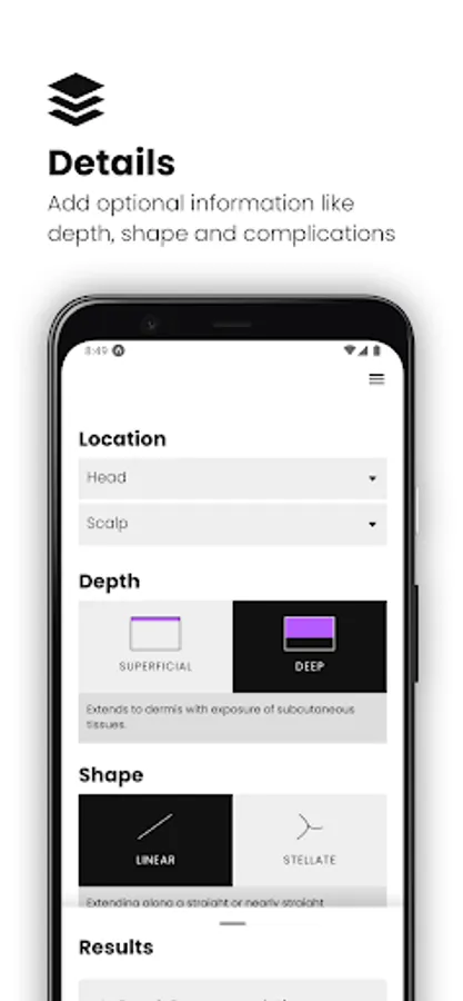 As soon as you select the laceration location, you'll start getting repair recommendations including suture material and sizes, other closure methods (like staples or hair apposition), technique references with guided videos and illustrations and instructions to share with patients including removal timeframes.