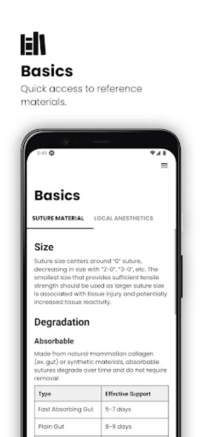 • Quick reference on suture types and local anesthetic use