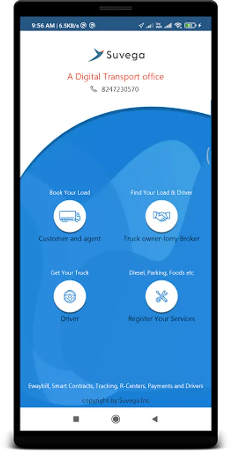 Shipping of goods made it easy, no need to make phone calls or follow up. The SuvegaFleet team will ensure trucks, drivers and customers are fully verified before the truck arrives at your place. It is not just app, it has 24X7 continuous tracking and monitoring call service center. Geotagging capabilities of app prevents the carrying of unauthorized goods on your trucks. The complete fleet management is free to use. Its unique multi user access protocol of location of goods and trucks makes shipping goods become absolutely secure ever. The communication capabilities of the app improve the truck utilization and reduce the cost of shipping.The SuvegaFleet platform integrates consumers, wholesalers, drivers, trucks, transporters, agents and brokers.