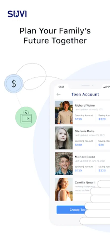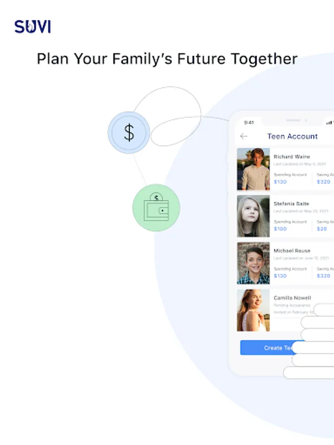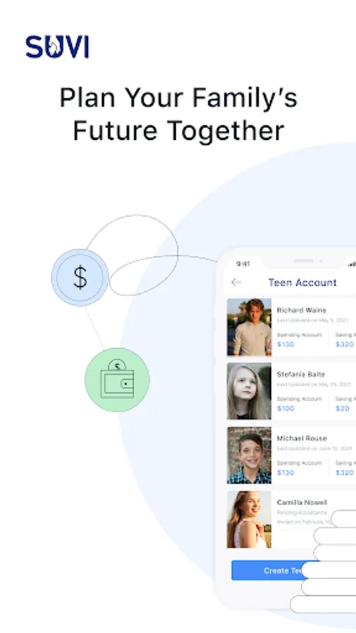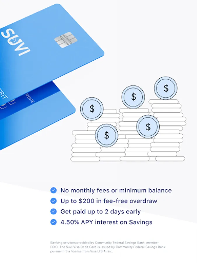 ^ Earn 4.50% Annual Percentage Yield (APY) on Suvi Savings Account on balances of up to $3,000 (including Pots linked to Savings Account and Teen Savings Account). APY is variable and may change at any time. To earn 4.50% APY, the Suvi Savings Account must meet the following requirements: $500 or more in qualifying direct deposits and debit card purchase transactions in the calendar month. In addition, the Suvi Checking Account and Suvi Savings Account balances must not drop below $0.00 on any calendar day of the month.