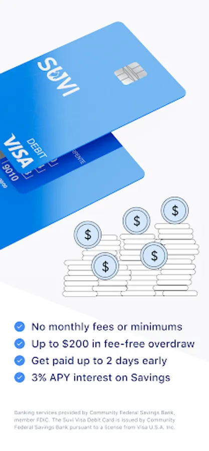 Banking services provided by Community Federal Savings Bank, member FDIC. The Suvi Visa Debit Card is issued by Community Federal Savings Bank pursuant to a license from Visa U.S.A. Inc.