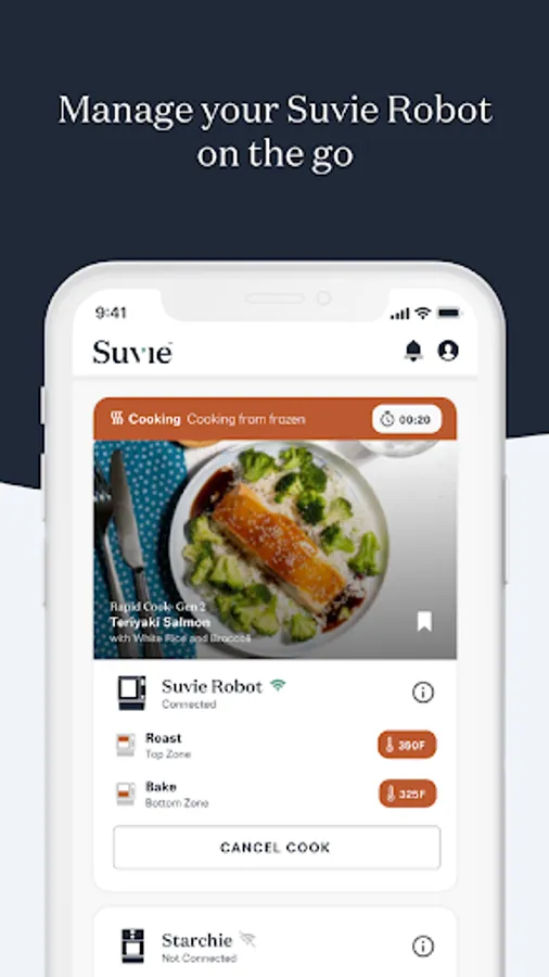 Suvie is your countertop kitchen robot created to help you save time and eat well. The Suvie app allows you to manage your Suvie Kitchen Robot by scheduling and monitoring cooks anywhere you go. Also, access hundreds of delicious Suvie recipes from the Recette Blog or order chef-designed Suvie Meals right to your door.