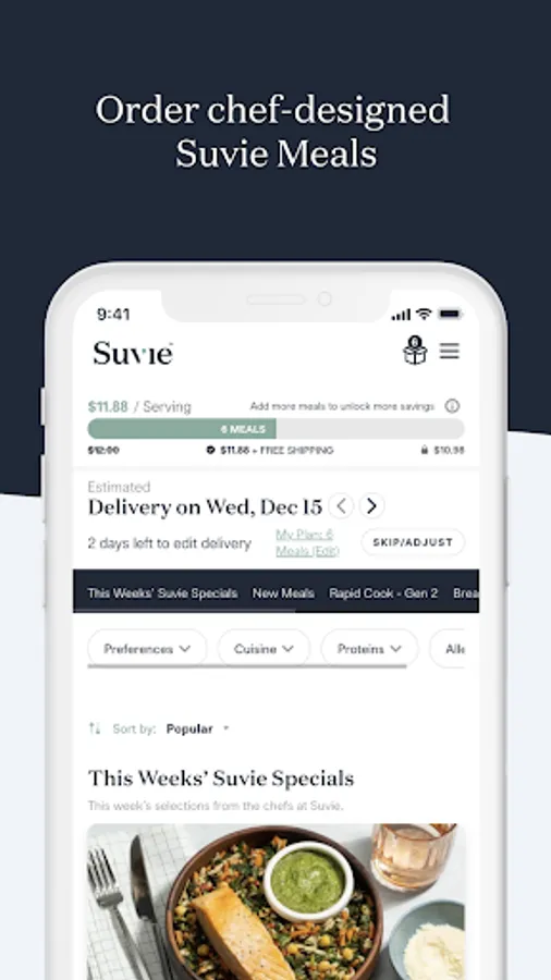 Suvie Meals save you even more time with flexible meal plans delivered directly to your door. Just scan, load, and let Suvie handle the rest. Explore our most popular meals in app- Use our meal planner to mix and match your perfect combination of meals from our 60+ options.