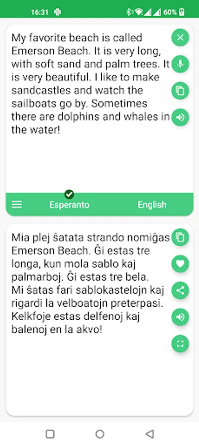 With this translator you can easily translate words and text from Esperanto to English and from English to Esperanto. You are able to translate words and even sentences, in just a split second.