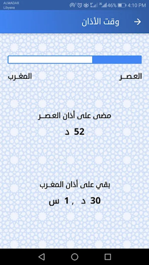 -Showing the time that has passed for the previous Adhaan and what time is left for the upcoming Adhaan on the main screen.