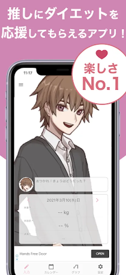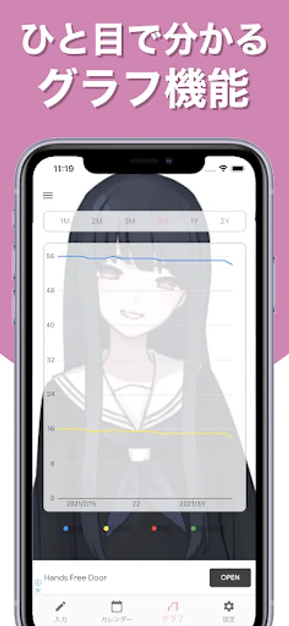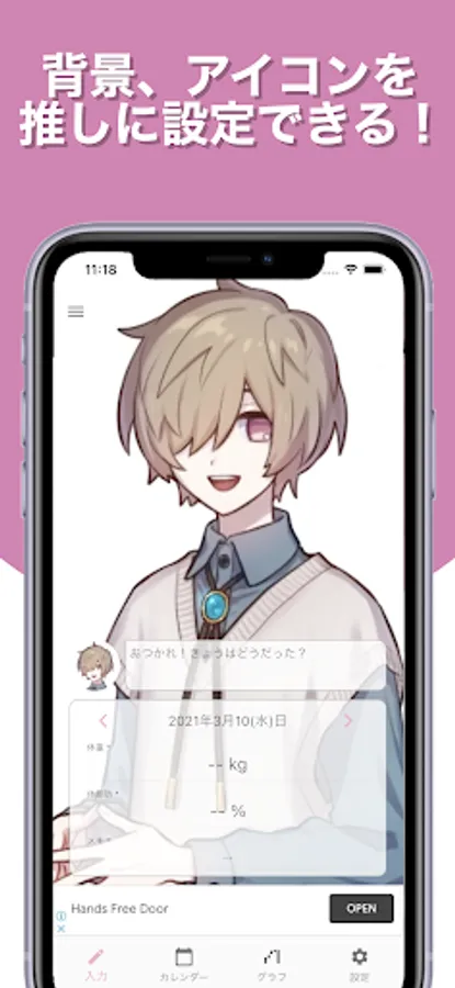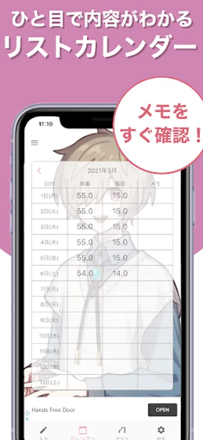 In addition to being able to set your favorite guesses as backgrounds and icons, it has a simple input screen, an easy-to-read list format calendar, and a graph function that allows you to intuitively understand changes in weight, body fat, and BMI, so you can record your weight very easily. increase!