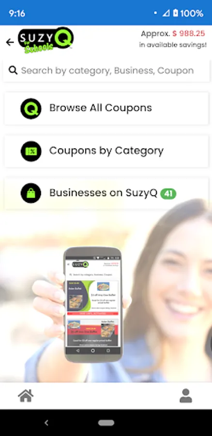 SuzyQ for Schools is a business that offers fundraiser discount cards and an easy-to-use app so that supporters always have their discounts and coupons with them on their smart phones!