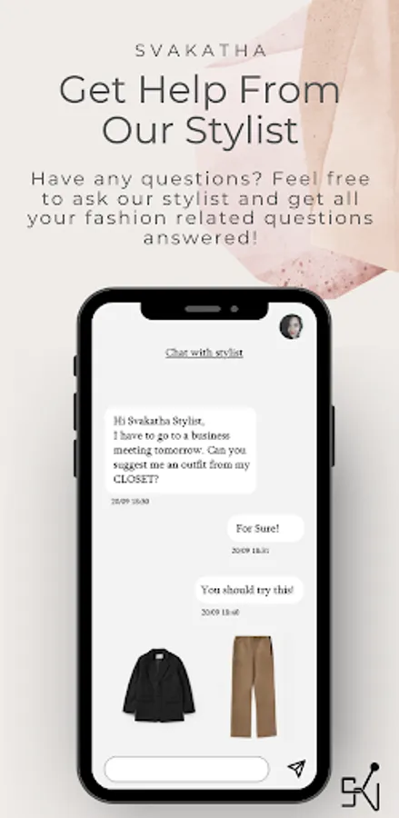 1) Get connected with a stylist: SvaKatha provides you with a personal stylist that will help you to find your style. Your stylist will also send you shopping recommendations so that you don't have to waste countless hours for searching new products. ( eg. Hi Svakatha stylist, need some suggestion for the office party?)