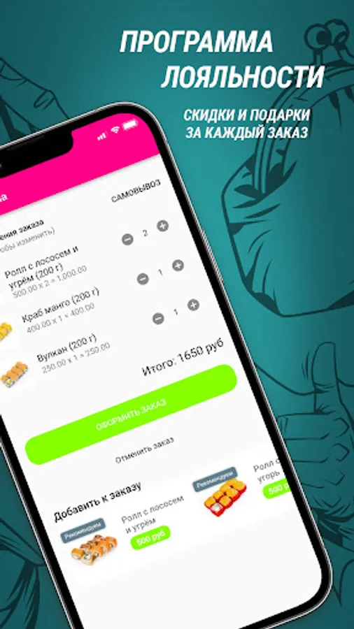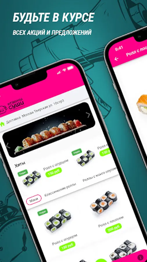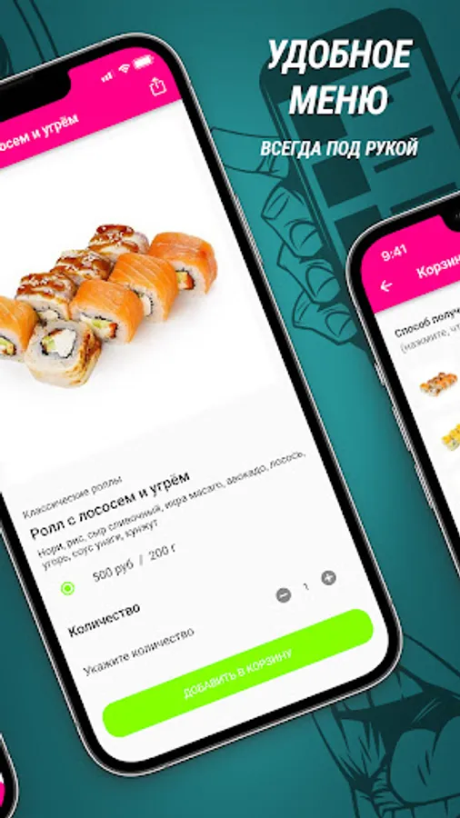 Download our mobile application and order sushi and rolls for delivery to your home, office or party, or take away dishes.