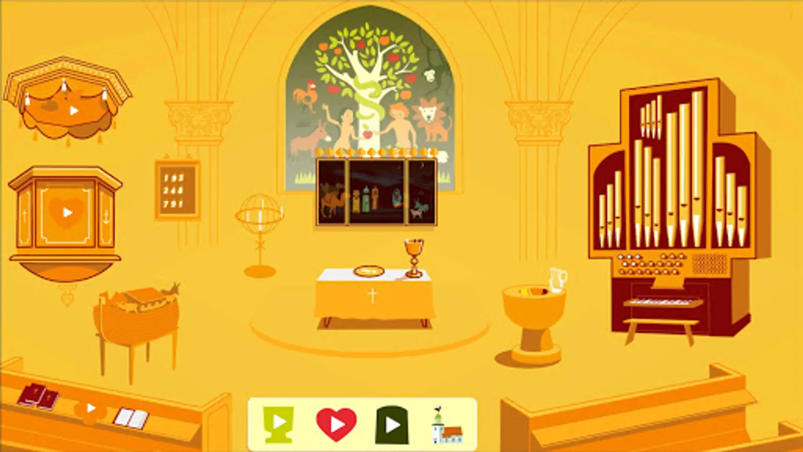 The church is a playful game of the Swedish Church. The game starts from the church and conveys Swedish church life, doctrine and traditions in a fun and educational way. For example, paint a church window, pouring water in the baptismal font, playing the organ, light a candle or play memory with the animals in Noah's ark. On the altar served communion wafer and becomes a puzzle with three levels of difficulty. The altarpiece shows an image of Jesus's birth, where you can move how you want.